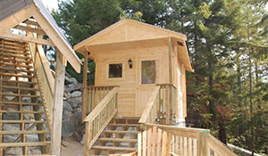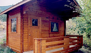 -This is one of our most UNIQUE cabins ever made. With the space limitations of this site and the need to house a person full time, this is an example of what can be done in a very small space. Amazingly it has a bathroom with toilet shower in the far back, a closet on the back left behind the shower which is accessible from the main room and of course the main front room area. In the main room, it has a twin bed with flat screen tv mounted on the back bathroom wall, it has a kitchen unit with sink, hotplate stove and sink plus a fridge and YES there's more, there is also a large storage chest for clothes by the door. Of course you are wondering how large is this MICRO CABIN ? In fact it's still under the 10 sq.meter size. Given that it's in Whistler BC Canada, and was built for the Winter Games held there, it needed to be warm so it has R40 insulation in the ceiling and R28 in the floor. This Micro Cottage shows what can be done in a small space !
