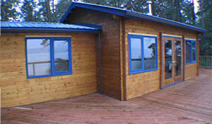incredibly popular cabin is this Bar 5C cabin found in Bragg Creek Alberta. The cabin is used as a weekend getaway for the family and is very similar to the Madrona in size. Clearly the look is different from the Madrona as it does not have the addition or the triangular windows and it is a bit smaller. We really like what the client has done with the cabin as seen, adding shutters and the lanterns amoungst other things but also the color is a departure from most of our cabins and it's a really nice change of pace, not that we don't love the color most of our cabins are, we chose it of course to bring out the wood tone and grain, but the beauty is in the diversity !